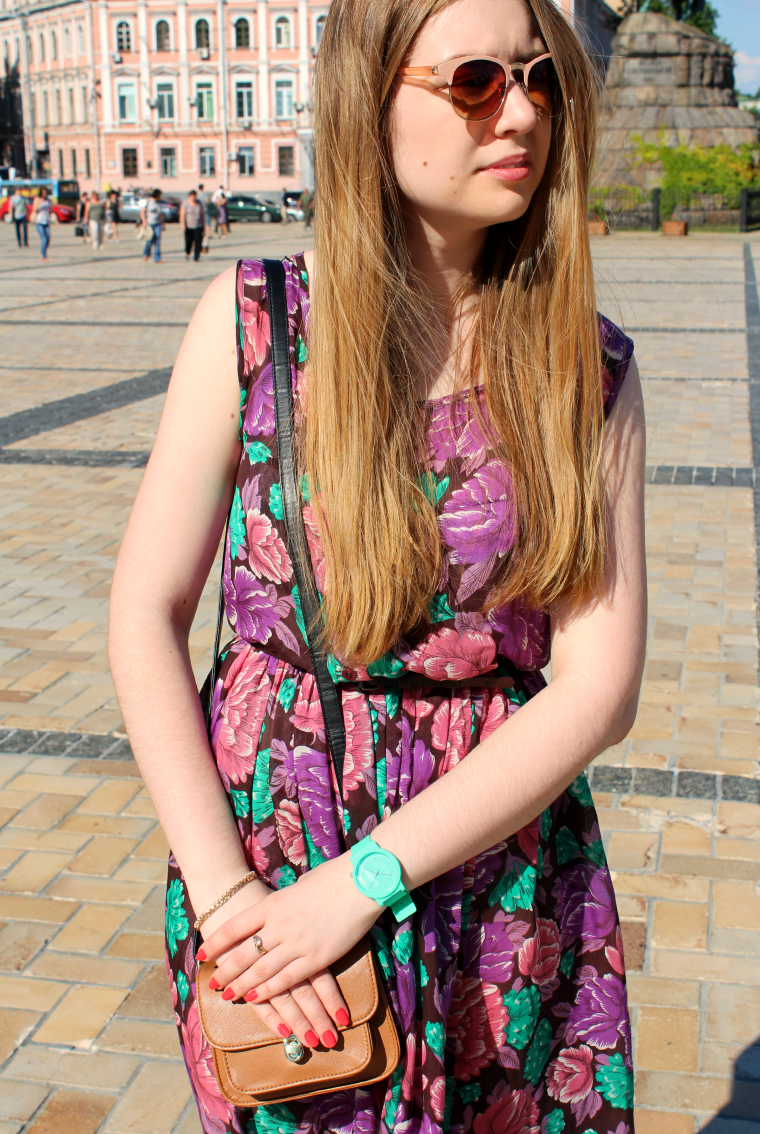 Fashion has always been one of my biggest passions and it is so cool when you are able to create a look from vintage items and those, which are in trend. I think, I've told you that before. By bringing new life to old clothes, you also feel alive. I've found this dress at my grandma's old suitcase and immediately fallen in love with the piece of material. This is not the first time when I realize that my granny has always been super stylish. The colors of the dress are bright and the fabric is very gentle. Moreover, look at the ideal match to the dress - the watch from Zavodshop. I think that mint color is the best option for the summer, so I try to have this Komono watch on me as often as it is possible.